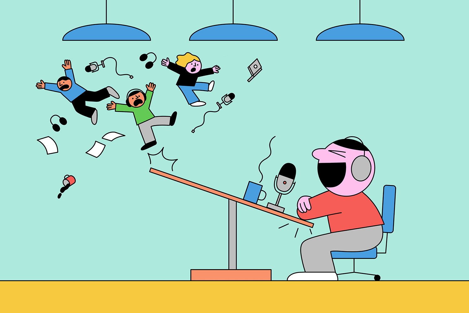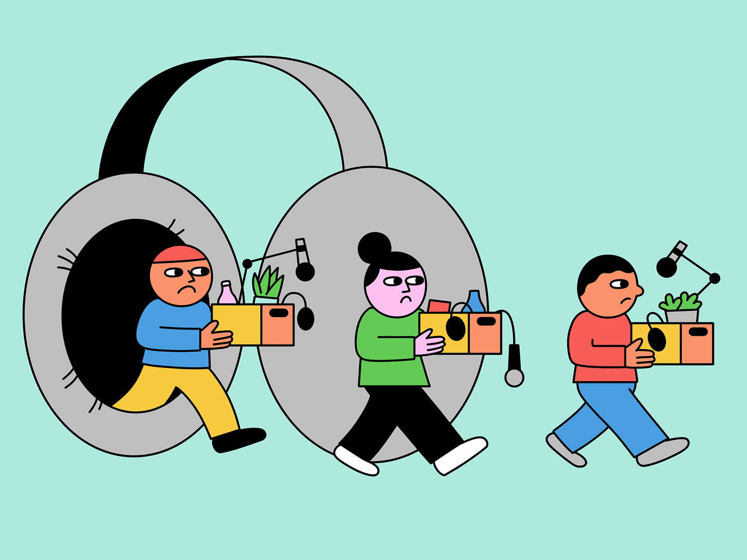 Illustrations for a feature exploring the badly handled takeover of Earwolf, a popular podcast network, by SiriusXM.
