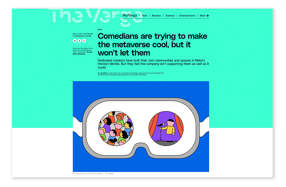 An illustration for a piece about a niche community hosting VR comedy nights in the Metaverse, and their struggles to be seen on the platform.